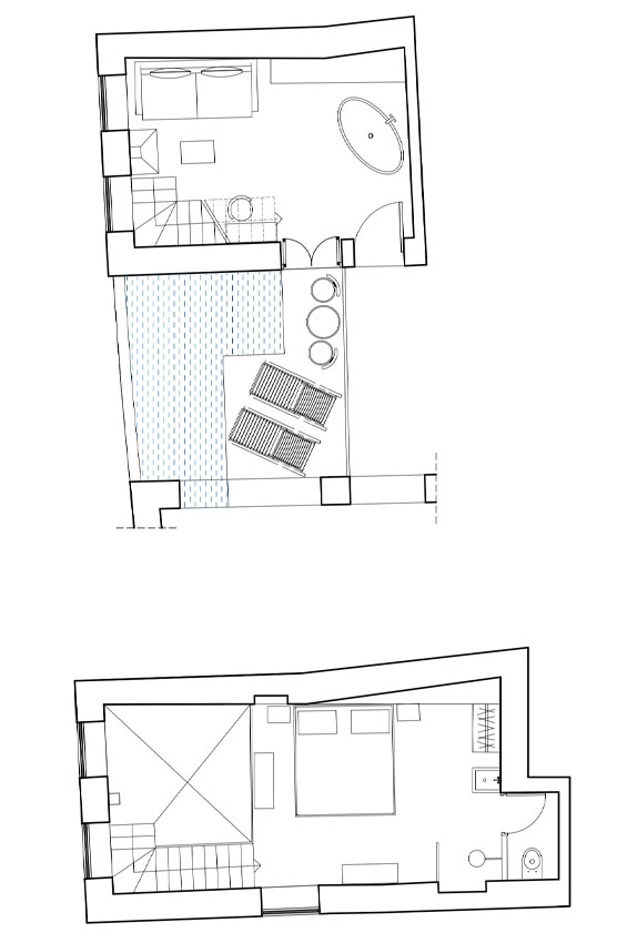 This is a two-level luxurious retreat. On the ground floor, the living room – with a view of the courtyard – with its fireplace is bathed in light thanks to the large, tall windows, which provide a view accessible from the upper floor. Ascending the wooden staircase, the bedroom, shower, and en-suite bathroom create the perfect nest of relaxation.